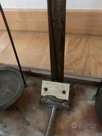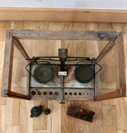 Antica bilancia a due bracci (tra le più antiche tipologie), composta da un fulcro, due bracci e due piatti contenitori. Questo tipo di bilancia è stata usata in passato da farmacisti. È dotata di pesetti in ottone, di cui 2 mancanti. La base in legno ha il piano superiore di marmo bianco venato. La bilancia è semi-chiusa da una teca in legno e vetro. Essendo antica si notano i segni del tempo. Vetro di sinistra lesionato. Non so a che epoca appartiene perché è stata da me ereditata.