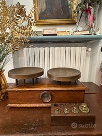 Vendo bilancia d’epoca a due piatti, risalente alla fine ‘800 / primi ‘900, con struttura in legno massello, piatti in ottone e set di pesi originali.
