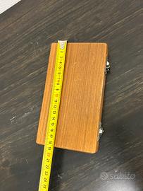 Bilancia a bracci uguali in ottone con doppio piattello sospeso, completa di set di pesi originali e accessori, conservata nella sua scatola in legno rivestita in velluto. Modello compatto da banco, probabilmente metà ’900, in buone condizioni generali.