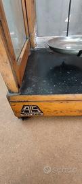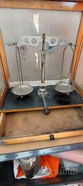 Bilancia di precisione analogica vintage con pesi mancante di vetro superiore e frontale