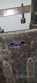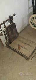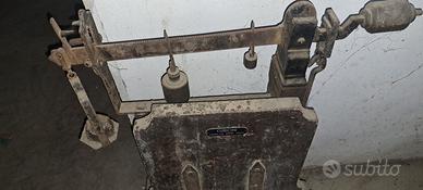 L'oggetto completo è costituito dalla bilancia e da 4 pesi di rapporto: due da 5Kg, uno da 1Kg e uno da 100g. Piattaforma oscillante di pesatura con parete verticale in legno, entrambie foderate di lamiera. Giogo graduato in ferro, con romano e nonio in ottone. Massa regolatrice in ottone regolabile a chiavetta, posta all'estremo del braccio minore; all'estremità del braccio maggiore un cestello per i pesi di rapporto, necessari ad aumentare la portata. Un gancio permette il bloccaggio del piano in posizione di riposo. Etichetta metallica: "Curioni - Como-Camerlata-Cantù"