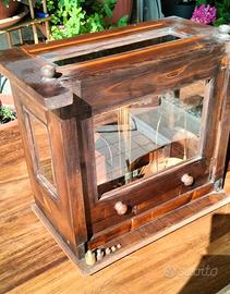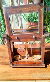 Bilancia tecnica con corpo interamente in ottone, inserita in una teca di legno con finestre in vetro. Acquistata in un mercatino e parzialmente restaurata. E' corredata di 5 pesi (senza pesiera).