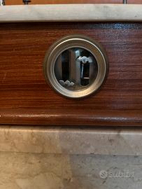 Base in legno, piano in marmo bianco e piatti in metallo.