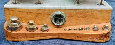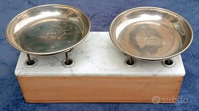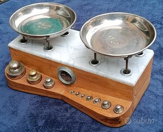 Bilancia vintage da cucina anni ‘40/’50. Mobile in legno naturale, sovrastato da lastra di marmo di Carrara, meccanica in ferro e 2 piatti in ottone cromato con calibratura marchiata, con alloggiamenti fresati per 10 pesi, e 10 pesi in ottone cromato da grammi 5, 10, 20, 50, 100, 200, 500, 1.000 e indicatore di livello della pesatura. Dimensione cm 40 x 22 x h20 circa; piatti diametro 19 cm; peso complessivo: 6,6 kg. Funzionante e in ottime condizioni.