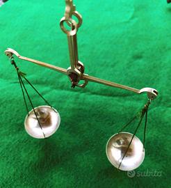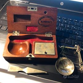 Bilancina di precisione Antica per pesare oro o pietre preziose in una custodia di legno (probabilmente Mogano). Realizzata tra la fine del XIX e l'inizio del XX secolo da O. RICHTER. La scatolina in legno massello include la bilancia stessa a due piattelli, un piccolo strumento paletta / pinzetta e una serie di pesi quadrati. Perfettamente conservata. Piccolissima 11 cm. x 6 cm. ed alta 3 cm. la chiusura a pressione funziona benissimo, tutte le viti e le cerniere sono originali. Non presenta alcun segno di restauri o imperfezioni. I pesi sono in totale 10 pz. da 1, 2, 3, 4, 8, 16, 32 Carati, più tre pezzi decimi di Carato visibili in foto.
