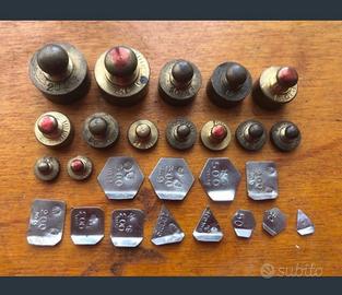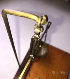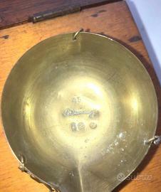 Antica bilancina in ottone con piattini e serie di pesi di varia grammatura con sigilli e punzoni antichi. Ideale per orefici o per ricaricare cartucce.probabile anni 1950/1960. Perfettamente funzionante. Per amanti del collezionismo.Prezzo non contrattabile