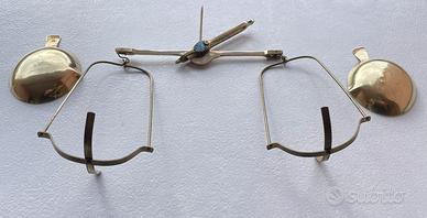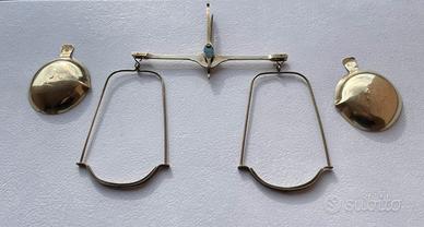 Bilancino a bracci uguali in ottone, utilizzata storicamente per pesare oggetti preziosi come oro o monete. Realizzato interamente in ottone. Struttura: Composta da un giogo centrale con estremità a forcella e due piatti sospesi. Strumento analogico che richiede contrappesi esterni per funzionare. Riconducibile fine 1800 inizio 1900