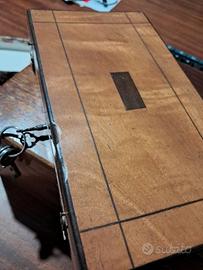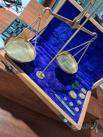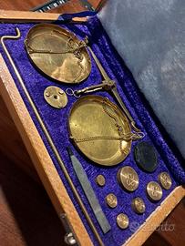 In originale scatola di legno con chiave un piccolo bilancino da professionista con i grammi per la pesatura da mettere sul piatto opposto (giusto per descrivere il metodo di pesatura) e la messa in opera sullo stesso contenitore in legno