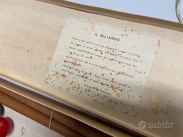 Biliardo giocattolo vintage con scatola originale, provvisto di stecche, palline e biccoli birilli.