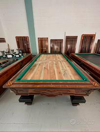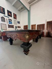 Proponiamo in vendita un pezzo di rarissima ebanisteria del XIX secolo (pieno 1800). Questo biliardo si distingue dai modelli industriali per una caratteristica tecnica d'altri tempi: il piano di gioco in legno di ULIVO massello, materiale nobile, denso e stabile, utilizzato prima della diffusione delle lastre di ardesia.
