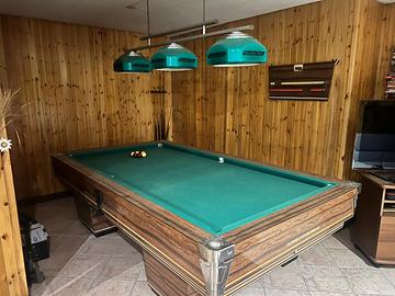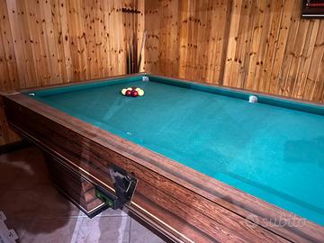 Bellissimo biliardo con le buche, luci, tappeto riscaldato. Bocce rosse e bianche pallino e gioco all'americana, compreso stecche e segnapunti. Smontaggio e trasporto a carico dell'acquirente