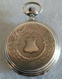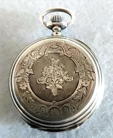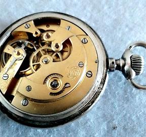 Uno splendido tasca risalente alla fine del XIX secolo o all'inizio del XX , questo squisito orologio é stato prodotto da "Zenit" per il mercato Austriaco e Ottomano con il logo "Billodes" . Di grandi dimensioni (mm. 52 per uno spessore di mm. 16) é un "Ancre Ligne Droite" 15 rubini di ottima manifattura orologiaia , meccanico a carica manuale con un quadrante in porcellana bianca immacolato , numeri romani in nero , lunetta secondi a ore 6 , eleganti lancette a "cattedrale" in oro e con un particolare sistema di messa a punto (evidenziato in foto) con leva seminascosta a estrazione . Cassa in argento 800 con fondello , coperchio e copripolvere finemente cesellati sempre in argento per un peso totale di gr. 137 (compresa catena) . Immacolato nonostante gli anni , perfettamente funzionante con buona tenuta di tempo e carica nonostante diversi anni di fermo . Un orologio di indubbia bellezza e fascino retrò , di ottima fattura , vera testimonianza di raffinatezza senza tempo , oggetto per amatori e collezionisti , corredato di una catena originale "Perseo" di grande spessore lunga 39 cm. in argento 925 .Le fotografie sono originali e parte integrante dell'articolo in vendita .