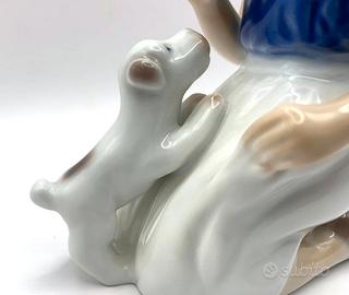 Statuina (fuori produzione) della famosa manifattura di porcellane Danesi di Copenaghen FIGURA : Bambina che gioca col cagnolino cucciolo di Terrier "Girl with puppy" N. 2316 *Statua disegnata dall'artista Vita Birgitte Thymann MATERIALE: Porcellana lucida dipinta a mano DIMENSIONE: Altezza 13 cm. Lunghezza 9,5 cm. Larghezza 6,4 cm. COLORE: Base bianca con tinte sfumate in Beige Rosa Blu e Marrone MARCA: B&G BING & GRONDAHL ( Royal Copenhagen ) Siglata e numerata Made in Denmark / Danimarca STATO: perfetto, pari al NUOVO (i riflessi più chiari o scuri, sono l'effetto del flash sulla Statuetta )