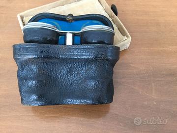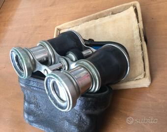 Vendo binocolo antico da viaggio e/o teatro, oggetto da collezione risalente ai primi del '900. Rivestito in pelle nera e struttura in ottone, lenti integre. Altezza totale cm. 6,5 ca. innalzabile fino a cm. 9 ca. tramite la meccanica centrale.