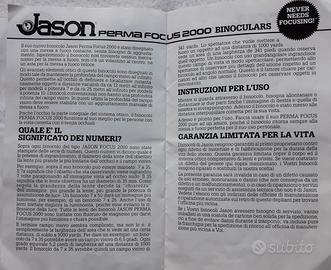 Binocolo Jason perma focus 2000, da 10x50 con wide angle 7,5°, messa a fuoco a partire dai 25 metri fino all’infinito senza regolazioni, fa tutto da solo, adatto a cacciatori o appassionati di passeggiate avendo un buon grandangolo permette di avere un’ampia visuale del paesaggio, tenuto benissimo, con lenti perfette come da foto, con custodia ed istruzioni.