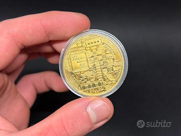 Moneta commemorativa Bitcoin dorata, completa di custodia protettiva. - Simboleggia la mitica criptovaluta n°1 - Design dettagliato con simbolo Bitcoin. - Finitura dorata lucida. - Custodia trasparente inclusa. Tirata fuori solamente per le foto