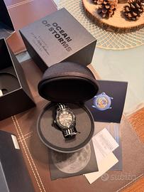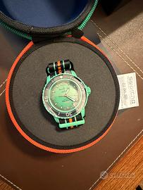 Spettacolari e ormai introvabili due modelli di Balncpain Swatch Bioceramica modello Ocean Of Storms e Indian Ocean. Orginali da negozio ufficiale Swatch come da garanzia timbrata in foto. Questo orologio Blancpain X Swatch rende omaggio al Fifty Fathoms di Blancpain, il primo vero orologio subacqueo. La cassa e la corona di colore verde sono in Bioceramic. La parola "Swatch" è incisa sul lato esterno sinistro della cassa. Il quadrante in metallo è stampato a più strati di colore per un effetto sfumato. Gli indici, le lancette delle ore e dei minuti e la scala sulla lunetta sono impreziositi con Super-LumiNova® di grado A per una migliore leggibilità al buio. La lunetta girevole unidirezionale in Bioceramic verde e il vetro di origine biologica sono trattati con un rivestimento antigraffio. Il movimento meccanico SISTEM51 è visibile grazie a un vetro zaffiro trasparente e presenta un'immagine in stampa digitale dell'oceano Indiano e del mollusco Nembrotha Kubaryana. Sul retro dell'orologio si trovano cinque brevi messaggi: PASSION FOR DIVING (passione per l’immersione) – LICENCE TO EXPLORE (licenza di esplorare) – OCEAN BREATH (respiro dell’oceano) – PROTECT WHAT YOU LOVE (proteggi ciò che ami) e IMMERSE YOURSELF (immergiti). Il cinturino NATO è realizzato in materiale riciclato proveniente dalle reti da pesca recuperate dal mare. La fibbia e i passanti sono in Bioceramic. Prodotto nuovo intonso ed originale Con scontrino e faranzia timbrata