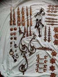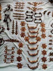 Blocco pezzi oppure singoli pezzi, peso totale circa 9 kg.prezzo. I pezzi sono più di cento, tra maniglie bronzo fregi rosette chiavistelli per mobilia d’epoca. Consegna a mano oppure spedizione. I pezzi erano di un mobiliere antiquario.
