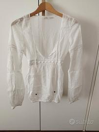 Vendo stupenda camicia/blusa brand Pinko originale, impreziosita da perline e coralli e ricamata con pizzo, colore bianco. Tessuto in cotone leggero, perfetta per la primavera, l'estate o per andare al mare da usare come caftano o copricostume.