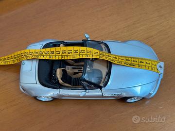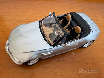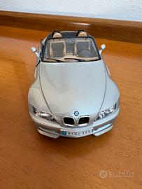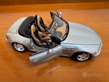 BMW M Roadster (Z3) 1996 - Bburago 1/18 Gold Collection - Made in Italy In vendita splendido modellino da collezione in scala 1/18 della BMW M Roadster (serie Z3), iconica sportiva bavarese. Modello originale Bburago d'epoca, prodotto interamente in Italia, caratterizzato da un'elevata qualità costruttiva die-cast. Produttore: Bburago (Made in Italy). Scala: 1/18 (Lunghezza circa 24 cm). Livrea: Carrozzeria Argento Metallizzato con interni bicolore Tan/Black altamente dettagliati. Funzionalità: Apertura delle portiere, del cofano motore (con riproduzione fedele del propulsore 6 cilindri M Power) e del bagagliaio. Sterzo funzionante collegato alle ruote anteriori. Dettagli: Loghi BMW originali presenti su cofano, baule e mozzi ruota. Cerchi a 5 razze specifici della versione M con dischi freno forati a vista. Condizioni: Eccellenti. Il modello è stato conservato in vetrina al riparo dalla polvere e dalla luce solare. Verniciatura brillante e componenti plastiche integre (specchietti e roll-bar perfetti). Note: Venduto senza scatola originale. Ottimo come pezzo da esposizione o per amanti del brand BMW M.