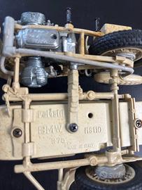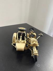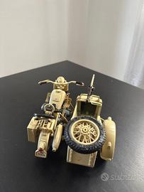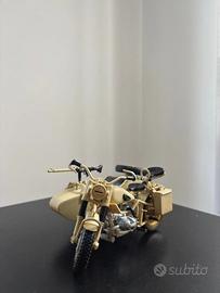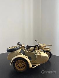Raffigura la BMW R75 con sidecar, veicolo militare tedesco della Seconda Guerra Mondiale in livrea deserto (Afrika Korps).