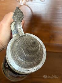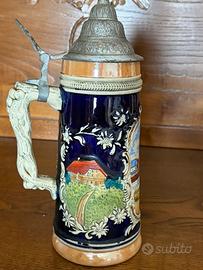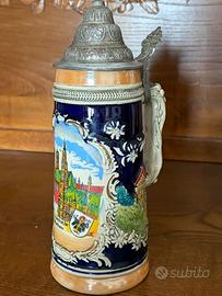 Elegante boccale da birra tedesco originale (Bierstein) in ceramica smaltata a rilievo. Decorazione: Raffinata scena di genere con coppia in abiti tradizionali bavaresi immersa in un paesaggio naturale. Colori vivaci su fondo ceramico chiaro (crema/bianco). Materiale: Corpo in grès ceramico e coperchio decorato in peltro con marchio DBGM (registrazione design Germania Ovest). Dettagli: Manico finemente lavorato con motivi floreali. Un pezzo che unisce la robustezza del boccale da taverna all'eleganza di un oggetto d'esposizione. Condizioni: Ottime, pari al nuovo. Nessuna sbeccatura, interno perfettamente pulito. Ideale per un regalo originale o per arricchire una collezione di boccali tedeschi. Disponibili altri 3 modelli diversi presenti nel mio profilo. Se interessati all’intero blocco prezzo 95€.