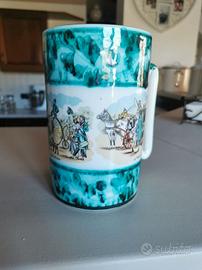 Vendo splendido boccale da collezione in ceramica della serie Golden Series – Canadian Style, prodotta da Extra Ceramic Production. Il decoro raffigura una vivace scena urbana del XIX secolo intitolata "L'Omnibus à 5 sols", con personaggi in abiti d’epoca, carrozze e biciclette storiche. La tazza presenta un elegante bordo marmorizzato verde e nero, dettagli dorati e un manico sagomato in stile zigzag. Sul fondo è presente il codice identificativo T.33403341, garanzia di autenticità.