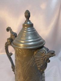 Boccale con coperchio in peltro al 95% con decorazioni floreali in stile Art Nouveau.Il boccale presenta un manico e un beccuccio decorati, il coperchio ha un pinnacolo scolpito e poggia su piedini.Reca un punzione i italiano con la scritta Puro Pel 95% e una in inglese con stemma araldico forse della corporazione artigiana che lo produceva. dim 18 x 12 x h 28 cm, pesa ca 1 kg ed è in ottime condizioni.