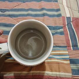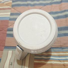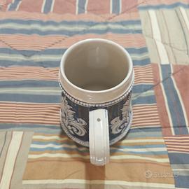 Boccale da birra vintage in ceramica con stemma del Sud Tirolo prodotto in Germania. - Raffigurazione di un'aquila con corona e rami d'alloro. - Scritta Südtirol sul fondo. - Bordi decorati con motivi blu e bianchi. - Altezza 13 cm - Diametro base 9,5 cm - Diametro bocca 7,5 cm - Colore grigio
