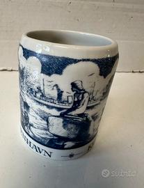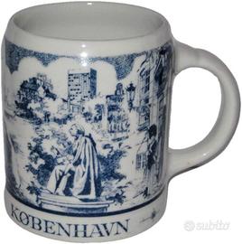 Questo boccale da birra vintage in porcellana (o gres) raffigura scene storiche della città di Copenaghen (København), in Danimarca. - Decorazione con paesaggio di Copenaghen - Altezza 11,5cm - Diametro base 10 cm - Diametro bocca 8,5 cm - Colore Bianco e blu