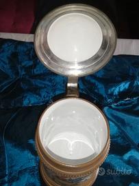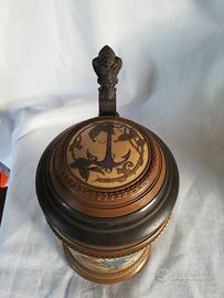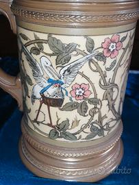 Fine ottocento, boccale in gres porcellanato, color nocciola/panna, smaltato, marcato Mettlach Gegen Nachbildung Geschutzi 1968 . Sul boccale è raffigurato una coppia che festeggia la nascita del loro figlio, in mezzo a rose e fiori. Sul coperchio è inciso un'ancora contornato da rami di rosa. L'interno è smaltato in ceramica bianca, perfetto. Non sono presenti né sbeccature e ne lesioni. In ottime condizioni generali. Altezza 20 cm e diametro 11 cm circa. Spese a carico del destinatario.