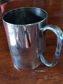 boccale vintage in metallo (probabilmente Sheffield o metallo argentato) caratterizzato da una linea pulita e classica. L’oggetto presenta diversi punzoni di autenticità vicino al manico e un’incisione frontale geometrica.