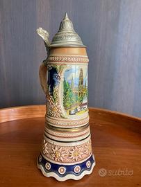Boccale da birra in ceramica a rilievo, tedesco vintage con coperchio in peltro. I n totale sono 15 bicchieri divisi in tre annunci. Si possono vendere singolarmete e tutti insieme