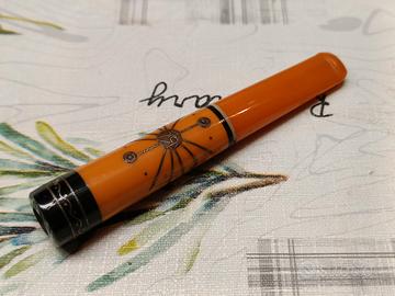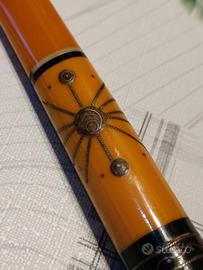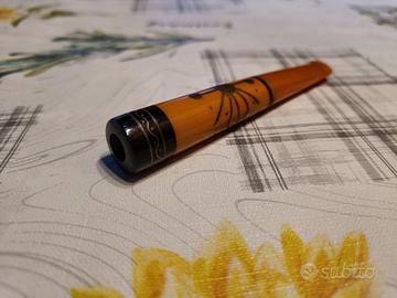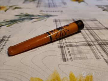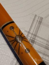 bocchino per sigaretta (o cannuccia da fumo) d'epoca, probabilmente risalente alla prima parte del 900. Lunghezza totale circa 12 cm Ambrato con intarsi metallici minuzioso di grande artigianato degli anni 20 Presenta un'estremità nera (probabilmente ebanite) con incisioni decorative e un disegno centrale che ricorda uno stile tra l'Art Déco e il tribale/folkloristico.
