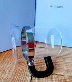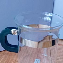 In vetro resistente al calore, fascia argento in metallo e manico nero in plastica dura.