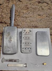 Vendo uno sterilizzatore per siringhe in vetro (o bolli siringa) in alluminio purissimo made in Italy marca cane degli anni 50 completo di siringa in vetro, ago numero 12 e filo metallico pulisci ago. Misura circa 15 cm per 6,5 cm. Altezza circa 5 cm. Le condizioni sono ben visibili in foto. Forte presenza di macchie di calcare.
