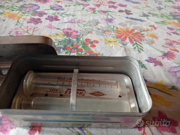 Antico bollitore inox degli anni 70 per punture. Con siringa in vetro. manca l'ago. È un oggetto di famiglia. Serviva x sterilizzare la siringa.