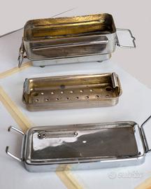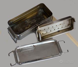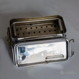 BOLLITORE X SIRINGHE IN METALLO inox , apparecchiatura sanitaria per sterilizzazione siringhe completo di coperchio, vassoio traforato e caldaia in acciaio Inox, voltaggio universale , dimensioni 16x6,5x6,0 cm usato in passato,