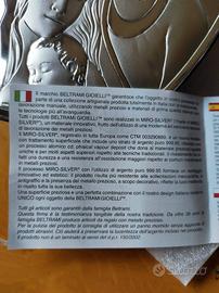 Lamina a sbalzo in "Miro-Silver" con soggetto religioso, di Beltrami Gioielli. Nuovo nella confezione originale. Tutte le caratteristiche in quarta foto, misure della scatola che lo contiene: 18x15x3,5 cm