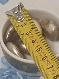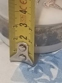 In vendita una raffinata e rara scatolina porta-confetti/gioielli in pregiata porcellana di Limoges, prodotta dalla storica manifattura M.A.B.A. Porcellane Artistiche (marchio visibile sul fondo, vedi foto). Questo elegante oggetto è stato creato per celebrare un 25° Anniversario di Matrimonio (Nozze d'Argento). Dettagli Chiave: Materiale: Autentica porcellana di Limoges bianca smaltata. Decoro sul Coperchio: Finiture in argento e oro, raffiguranti due fedi nuziali intrecciate unite da un fiocco, un bouquet floreale e due delicate colombe in volo. La scritta "25 Anniversario" è in elegante corsivo color argento. Dettagli Corpo: Una fascia decorativa color argento brunito avvolge la base. Contenuto: La scatolina include 4 confetti decorativi in tonalità argento metallizzato (come mostrato nelle foto 4 e 5). Condizioni: Usato, ma in condizioni eccellenti. La porcellana non presenta sbeccature o crepe. I decori metallici sono ben conservati. (Si prega di esaminare attentamente le foto per i dettagli). Dimensioni: Diametro base circa 6.5 cm, altezza circa 4.5 cm (per misurazioni precise vedi foto con metro). Un pezzo da collezione perfetto come regalo vintage per una coppia speciale o per arricchire una collezione di porcellane artistiche. Spedizione tracciata e imballaggio accuratissimo garantito.