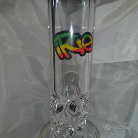 Bong RIO in vetro borosilicato spesso, compatto e resistente, con logo rasta colorato e bocca rinforzata nera lucida. Un modello dal design semplice ma di carattere, pensato per offrire tiri morbidi e puliti. Alto circa 25 cm, è un pezzo raro e ben conservato, perfetto per chi cerca qualità e stile in un formato compatto.