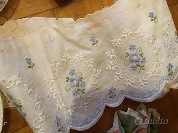Lotti di bordure, pizzi e passamanerie per lavori di cucito e sartoria. - Nastro bordeaux con motivi geometrici bianchi. - Nastro bianco con fiori azzurri. - Nastro color crema con cerchi decorativi gialli. Vendo in blocco . valuto comunque offerte previo accordi per pezzi singoli