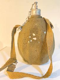 Borraccia in alluminio con tappo, ricoperta in panno verde e tracolla. Del dopo Seconda Guerra Mondiale WWII World War II Possibilità di spedizione