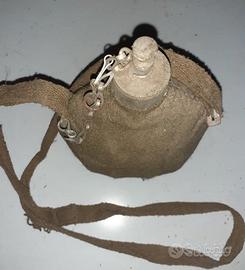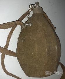 Vecchia borraccia dell'Esercito Italiano probabilmente in alluminio ricoperta di tessuto verde militare, tappo a vite con catenella e cinghia a tracolla per il trasporto. Il tessuto è un po rovinato in qualche punto e avrebbe bisogno di una bella ripulita. Sulla parte frontale sono state segnate due iniziali "C" ed "E" , sono le iniziali di mio nonno, la borraccia apparteneva a lui, ma non so a che epoca risale, la borraccia era conservata in cantina assieme ad altri vecchi oggetti. Bell'oggetto militare da collezione e da esporre in vetrina.