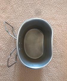 Borraccia militare e gavettino in alluminio con custodia. Capacita’ di circa 1,3 Lt. Leggera rientranza sulla pancia della borraccia, visibile nella prima foto. In ottime condizioni.