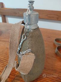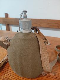 Borraccia militare esercito italiano realizzata in alluminio con tappo a vite in metallo. Rivestita da una fodera in feltro grigio verde, adatta ad essere bagnata per mantenere l'acqua più fresca. Dotata di una tracolla regolabile in fettuccia, ha una capienza di circa un litro.