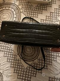 Borsa vintage in autentica pelle di coccodrillo glazed, manifattura italiana anni ’60, con dicitura “Rettilе 100”. Colore nero lucido, struttura rigida, tre scomparti interni e tre taschine (una con chiusura a zip). Interno in pelle e seta, cuciture originali, una taschina leggermente scucita da un lato.