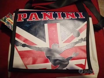 Borsa a tracolla con bandiera del Regno Unito come sfondo e illustrazione di un giocatore in azione. Articolo mai usato, pari al nuovo con etichetta Panini ancora attaccata. Oggetto da collezione raro e ambito tra gli estimatori Panini vintage.