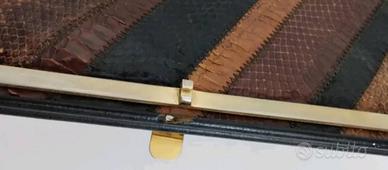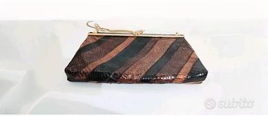 Borsa vintage in vera pelle, risalente agli anni '60. Un accessorio unico con un design a righe in diverse tonalità di marrone e nero con una tracolla dorata