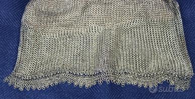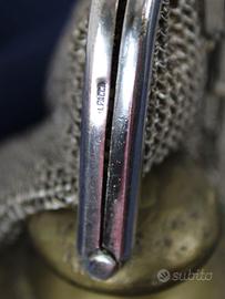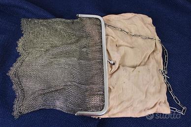 Originale e preziosa borsetta da sera, in alpacca, a maglia di rete flessibile. Piacevole cimosa a frangia sul fondo. Completa con la sua fodratura interna originale in raso, dell'epoca.